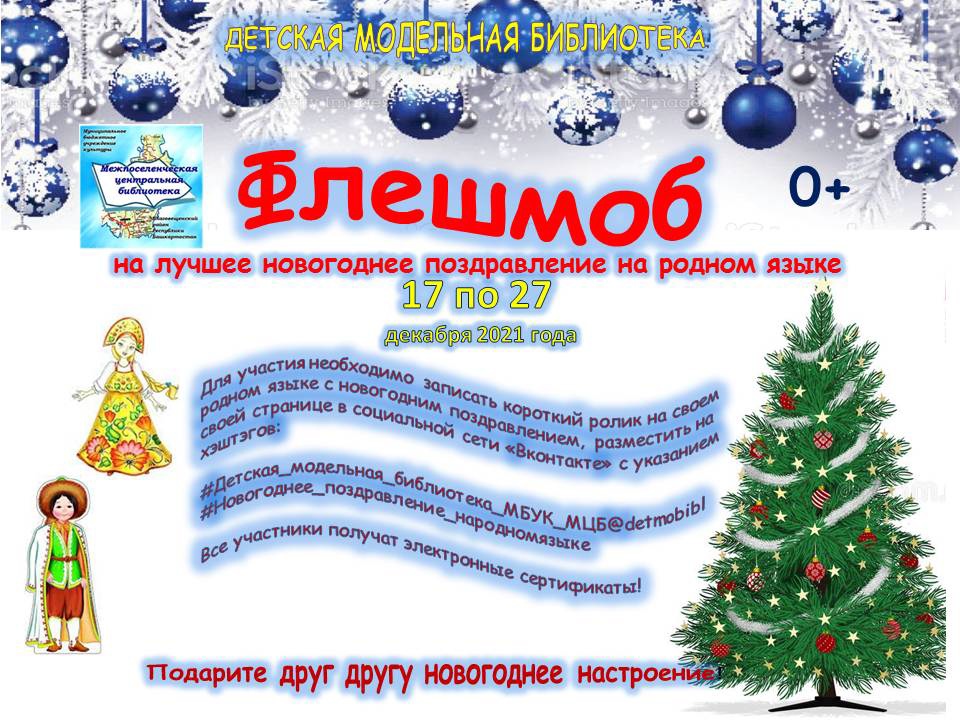Для участия необходимо записать короткий ролик на своем родном языке с новогодним поздравлением, разместить на своей странице в социальной сети «Вконтакте» с указанием хэштэгов: #Детская_модельная_библиотека_МБУК_МЦБ@detmobibl