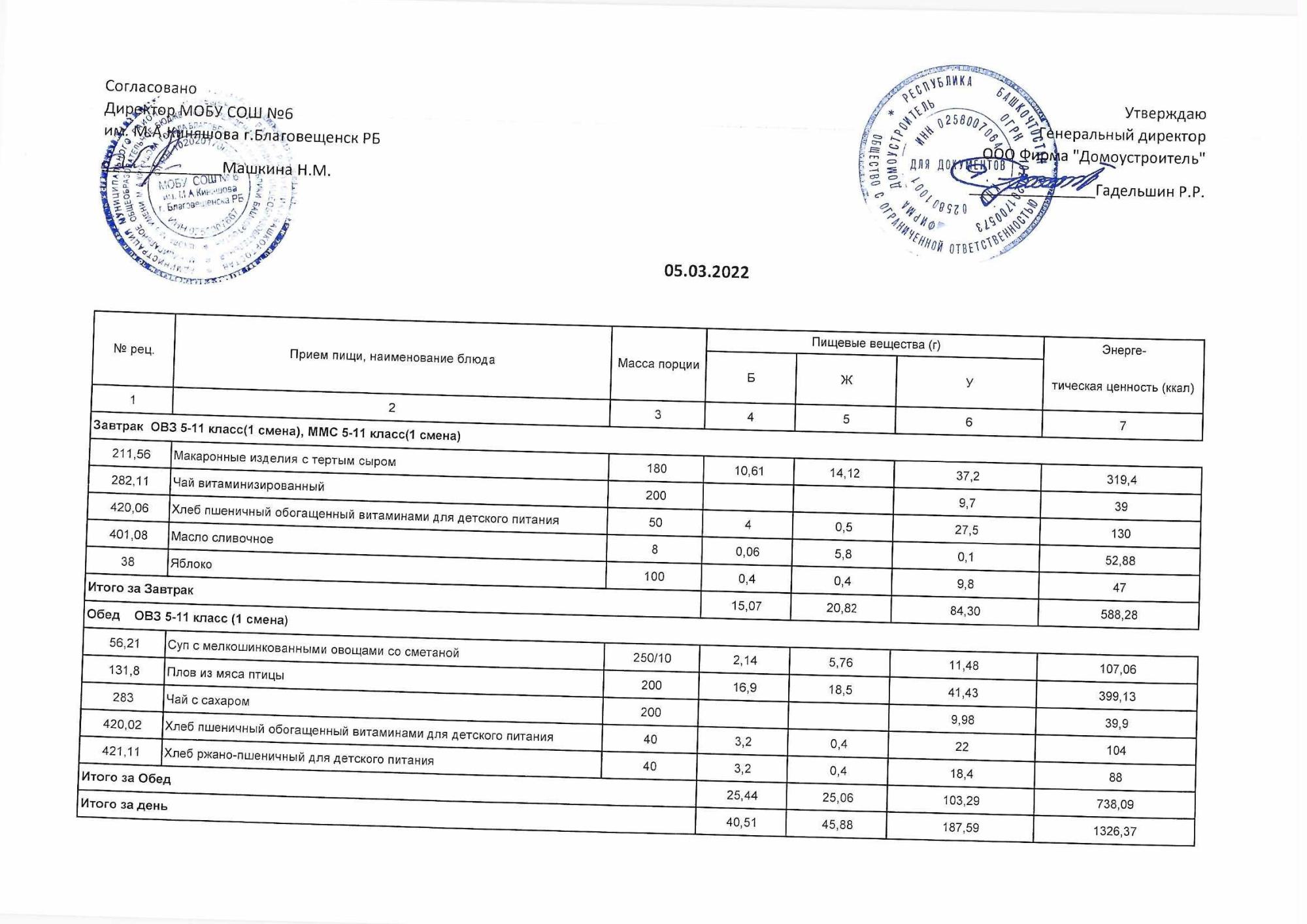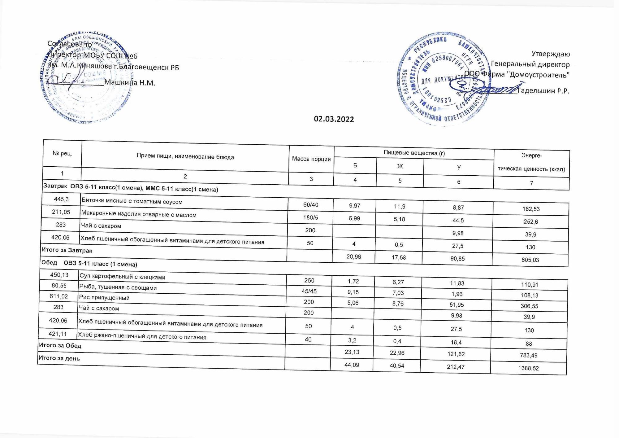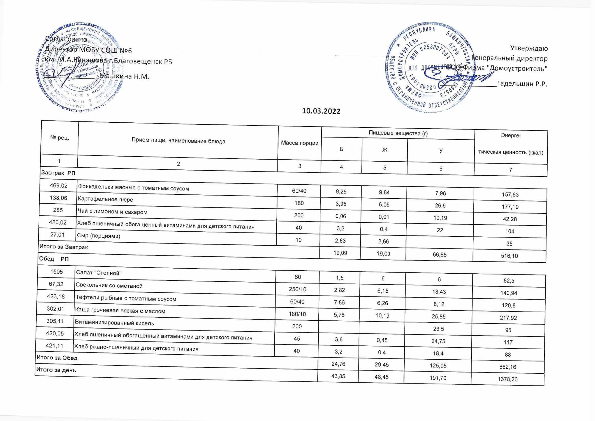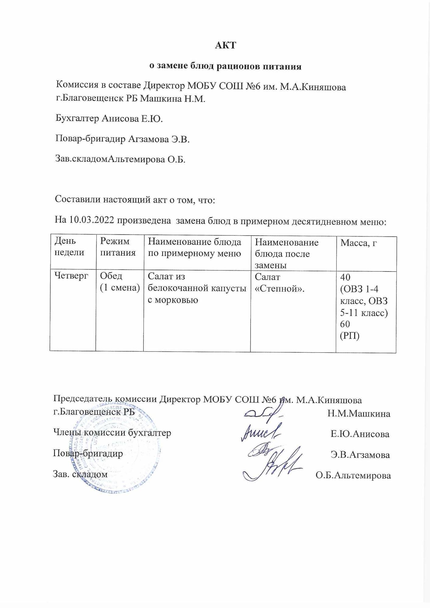 (Акт о замене блюд)