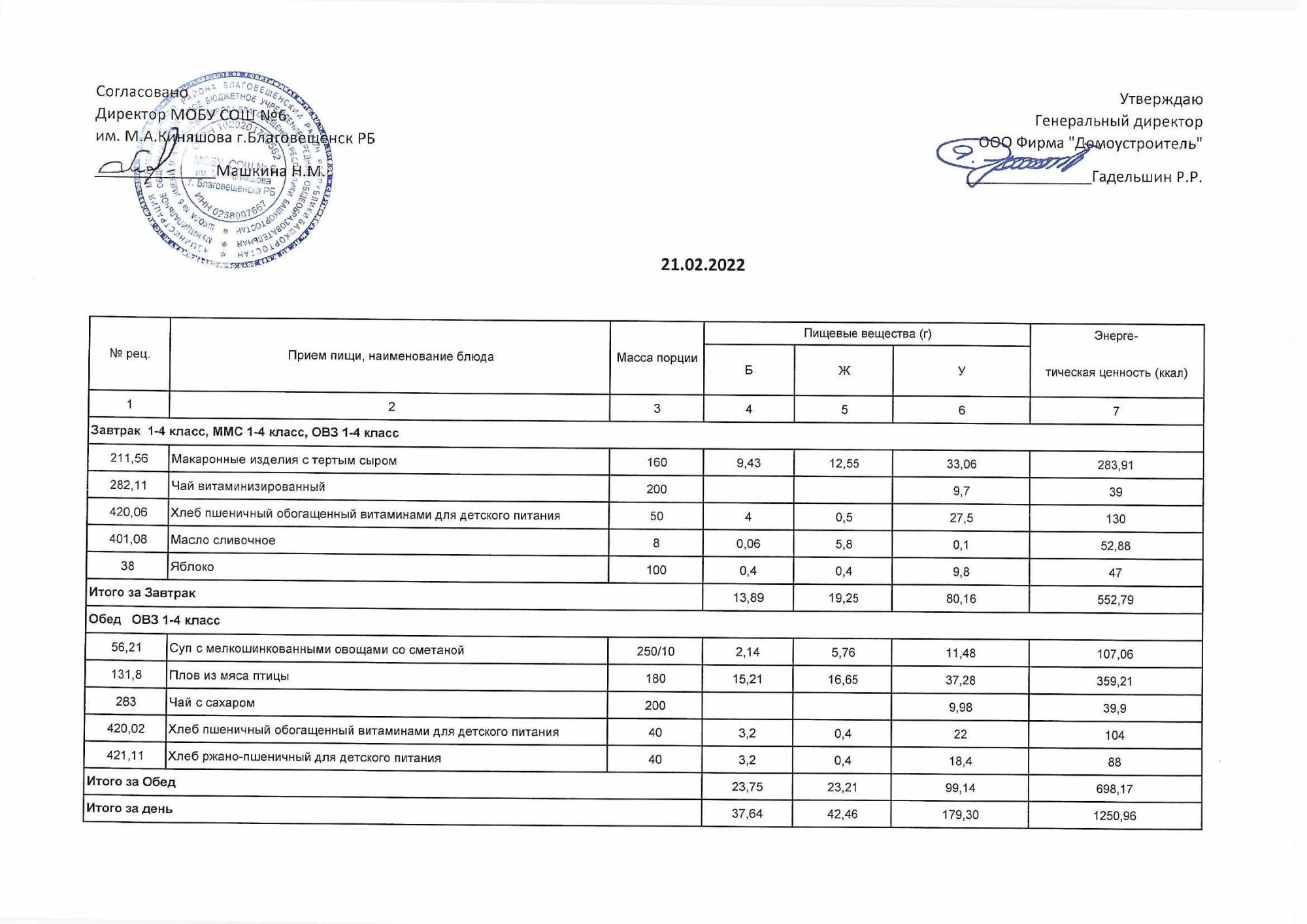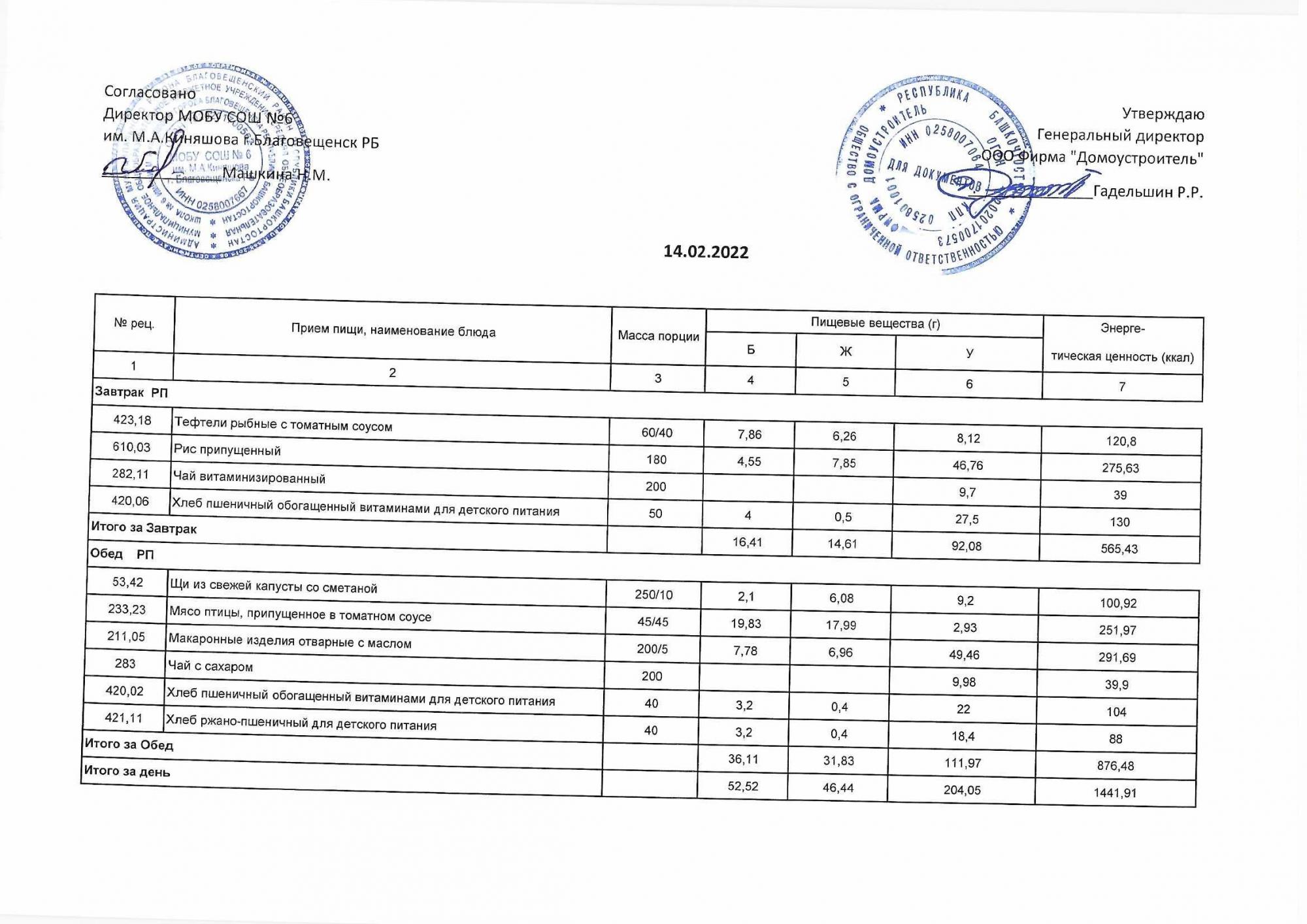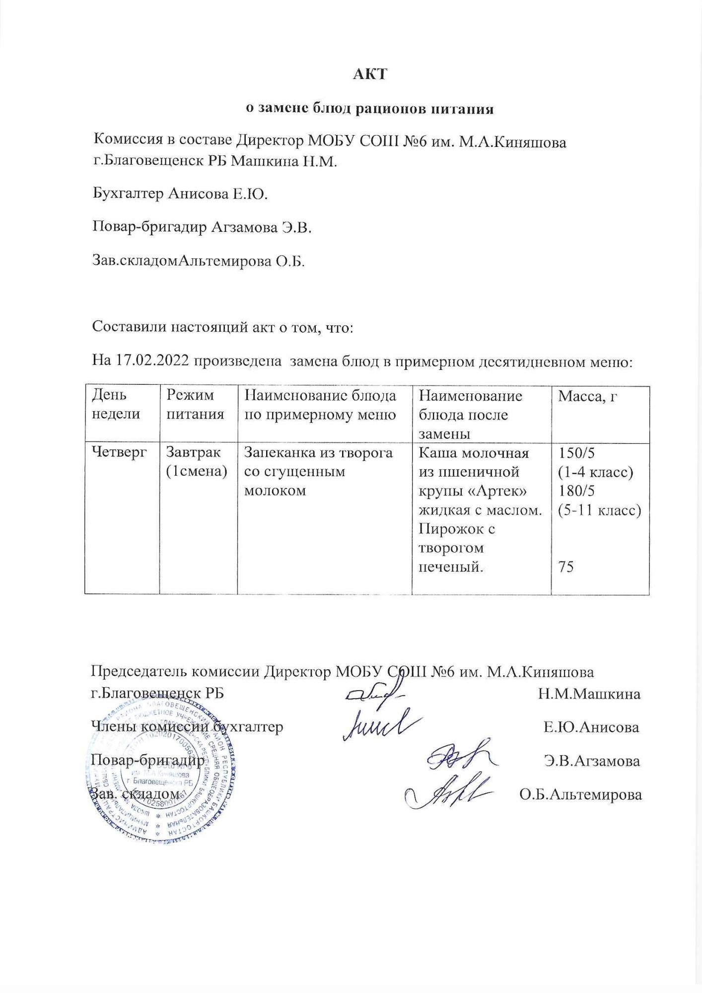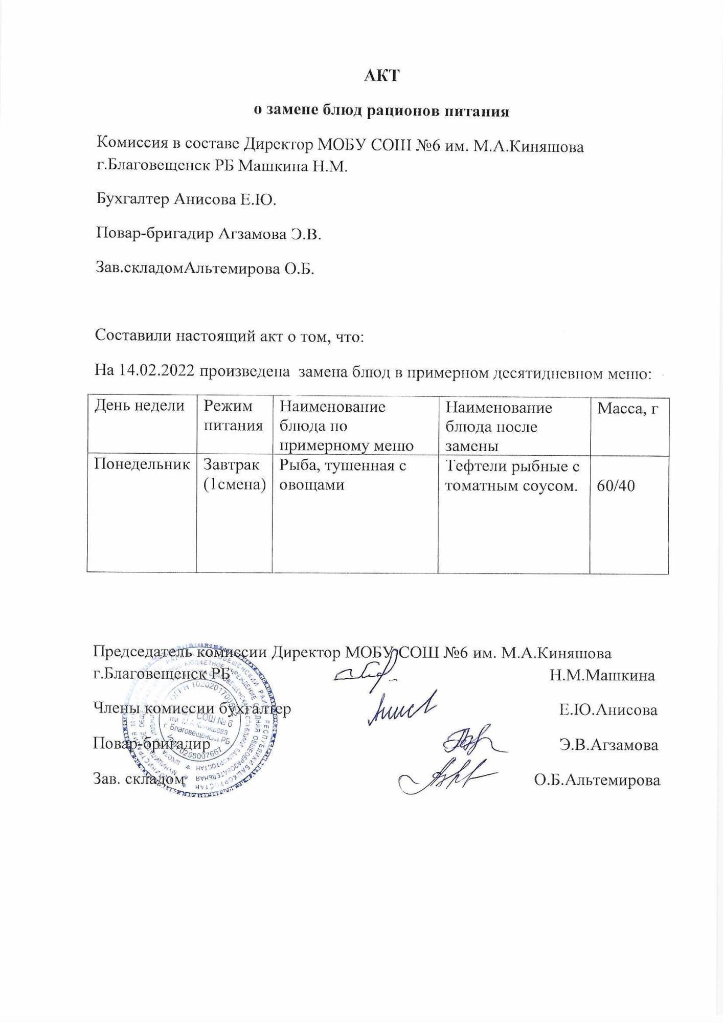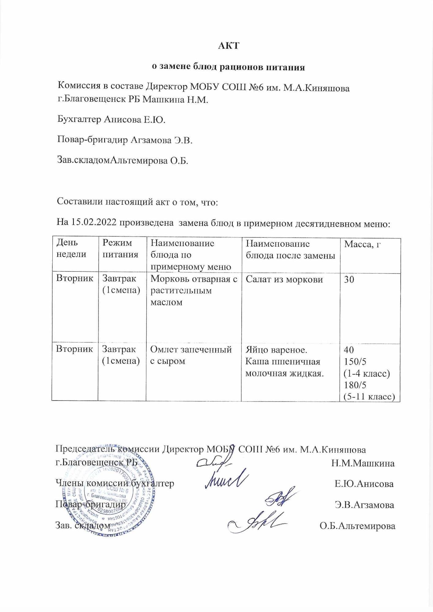 (Акт о замене блюд)